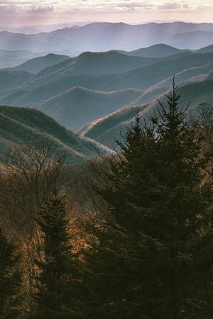 Beams of light shining on The Blue Ridge Mountains of North Carolina
